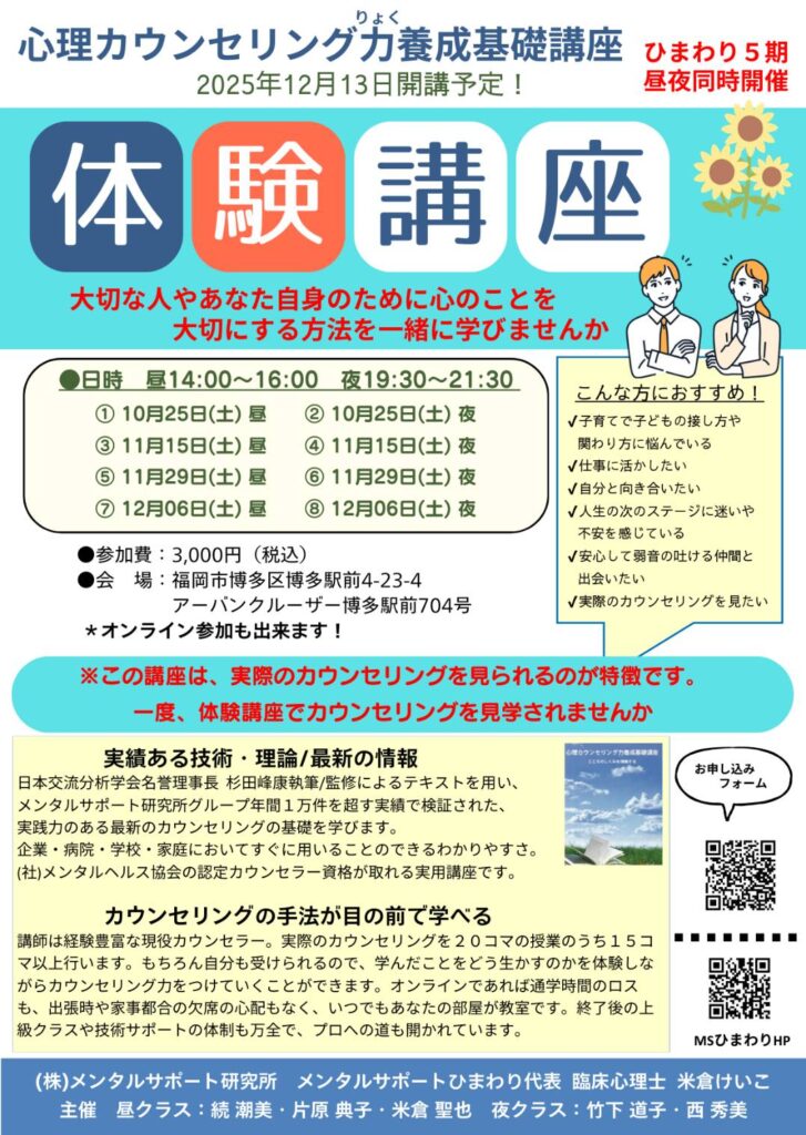 心理カウンセリング力養成基礎講座 ひまわり5期生を募集しています。