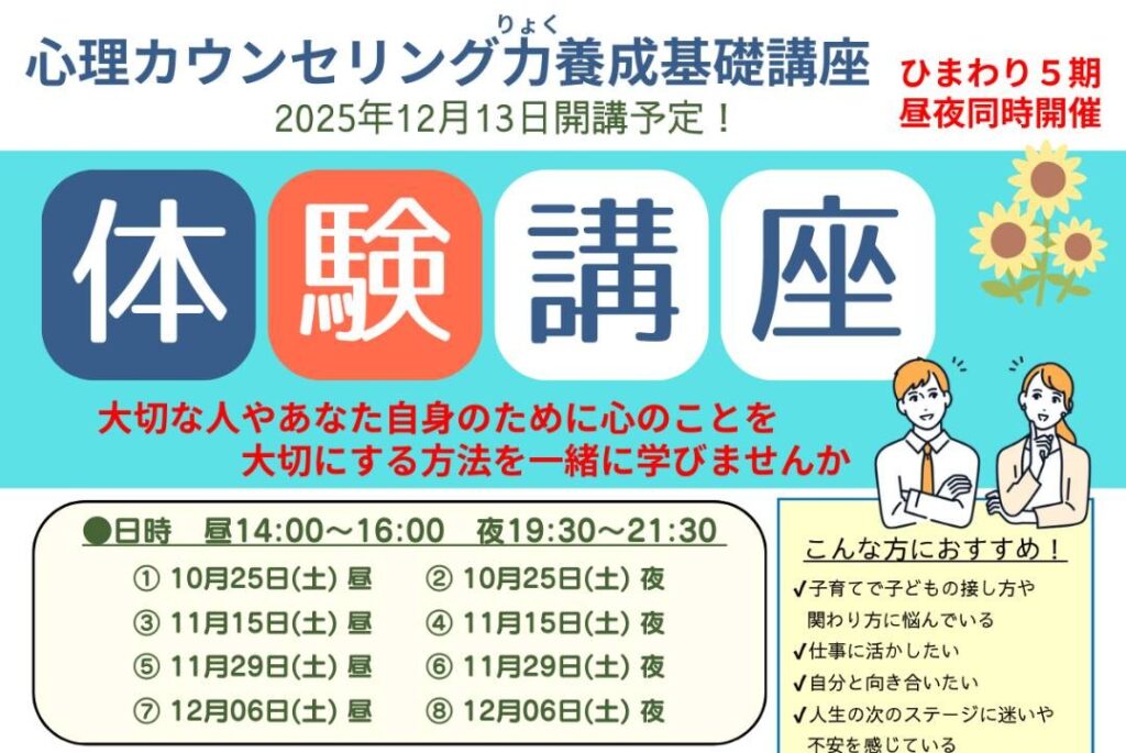 ひまわり5期 2025年12月13日(土)開講予定! 昼クラス・夜クラス同時開催 体験講座を開催します! 自分を大切にすることから幸せの輪が広がる。心の学びで毎日がもっと笑顔になる。 この講座は、実際のカウンセリングを見られるのが特徴です。一度、体験... -